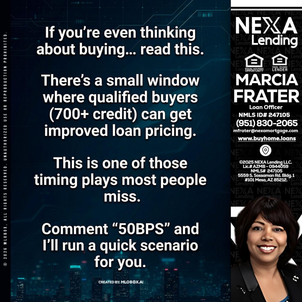 Hi, my name is Marcia Frater. I’m a Loan Officer with NEXA Lending LLC., offering personalized mortgage solutions, fast customized quotes, great rates and service with integrity.