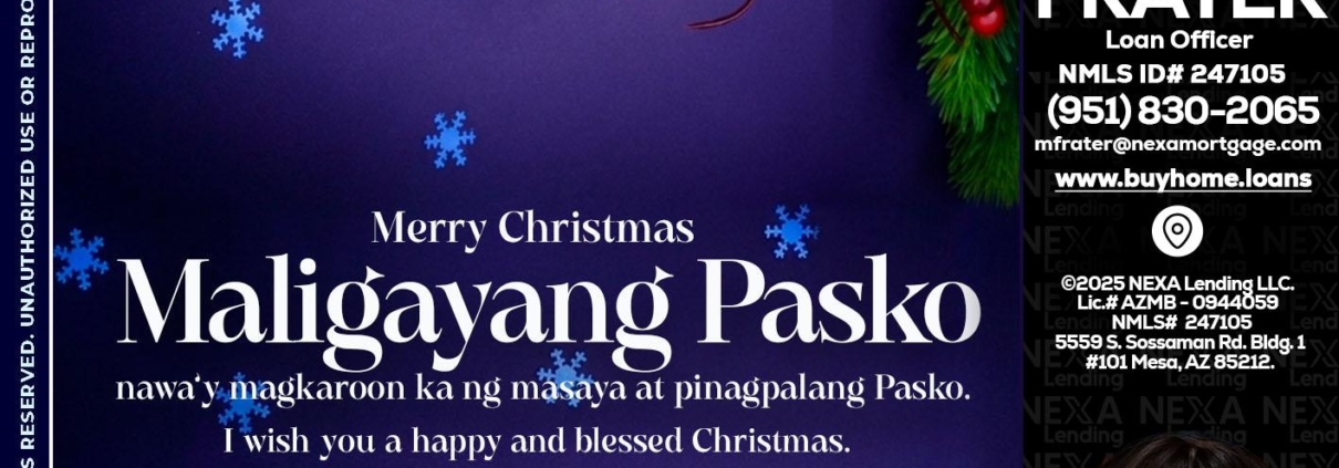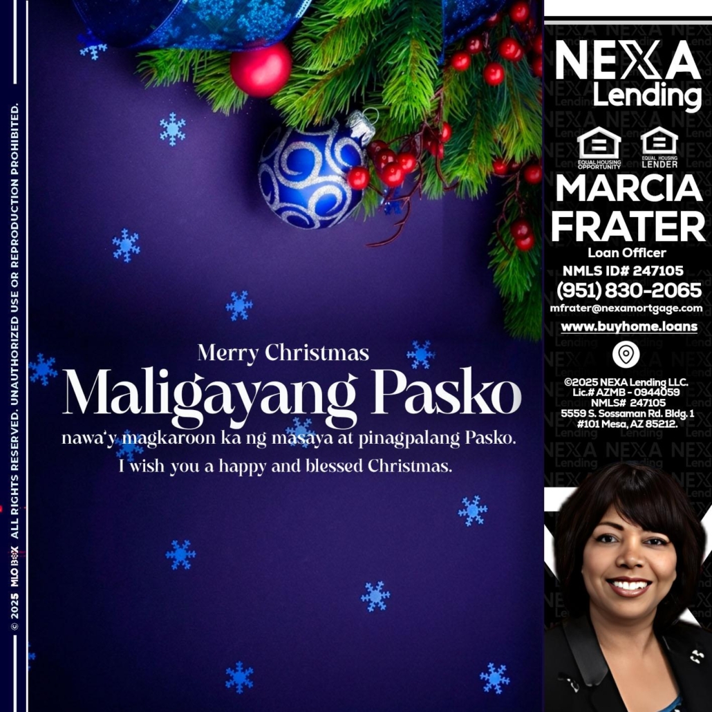 Maligayang Pasko - Marcia Frater -Loan OfficerHi, my name is Marcia Frater. I’m a Loan Officer with NEXA Lending LLC., offering personalized mortgage solutions, fast customized quotes, great rates and service with integrity.