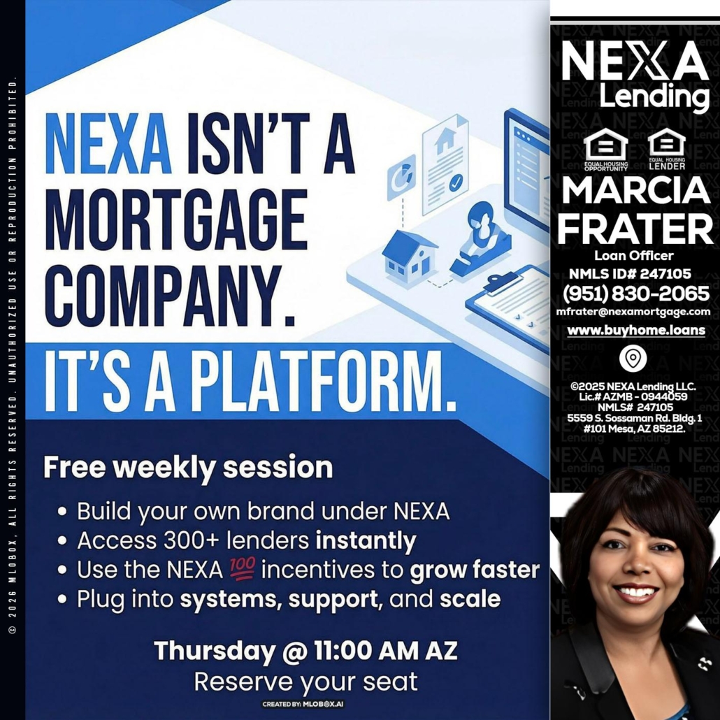 NEXA ISNT - Marcia Frater -Loan OfficerHi, my name is Marcia Frater. I’m a Loan Officer with NEXA Lending LLC., offering personalized mortgage solutions, fast customized quotes, great rates and service with integrity.